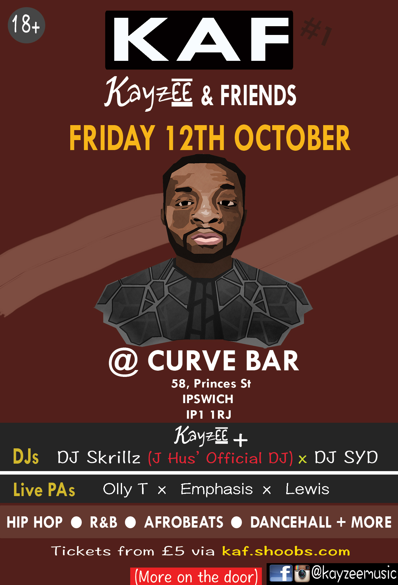 Kayzee presents KAF, a night of great music & performances featuring: DJs: Kayzee, DJ Skrillz (J Hus' official DJ) & DJ SYD Live PA from: Emphasis, Lewis, Olly T Music policy: All Urb...